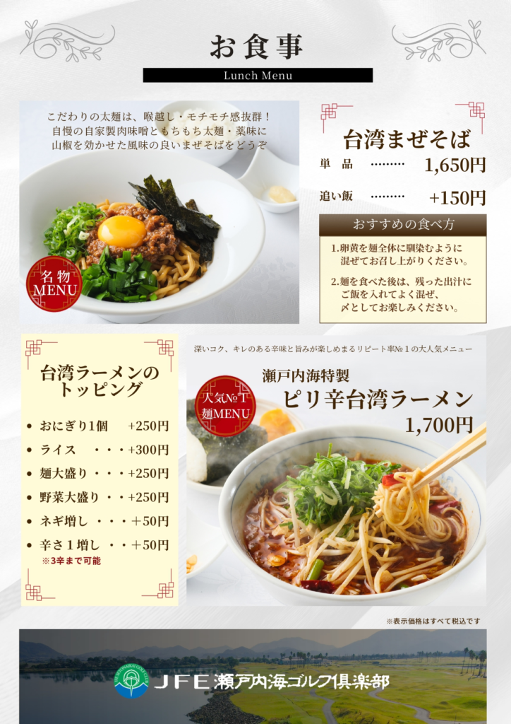 ランチは料理長オススメの『牛ホルモン味噌炒め定食』(¥2,000)が第1候補。『台湾まぜそば』(¥1,650)も捨てがたい。モリモリ食べて後半に備えます!
