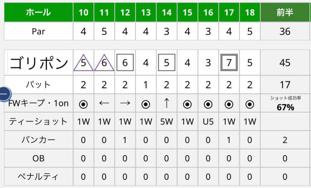 - ・平均スコア6.74、パーオン率14%