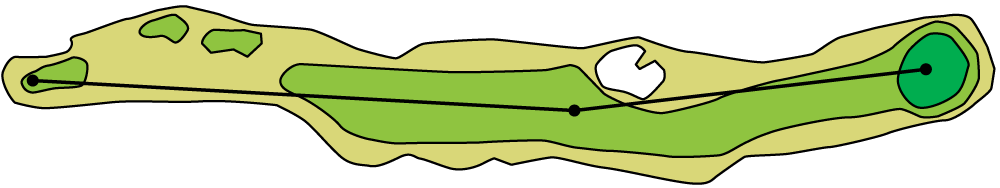 ハザードたっぷりの左にドックレックするミドルホール。左からのフォローの風もあり、ティーショットは飛ばしすぎると右の隠れバンカーまで届きそうなので、4番ユーティリティでレイアップしてフェアウェイをキープ。