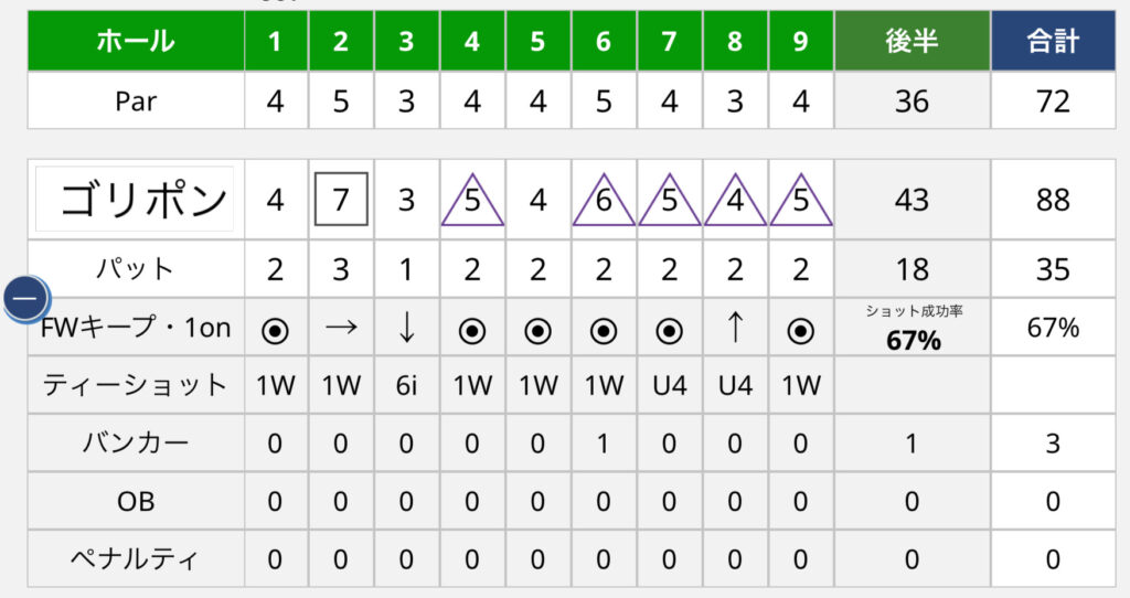 セカンドは得意の5番ユーティリティで刻むも見事右サイドのグラスバンカーへズドン(涙)3打目はグラスバンカーの影響か距離感が合わずグリーンまで届かず。アプローチで乗るも傾斜で止まらずグリーン奥へ。そこから3パットして結局ダボでホールアウト。
