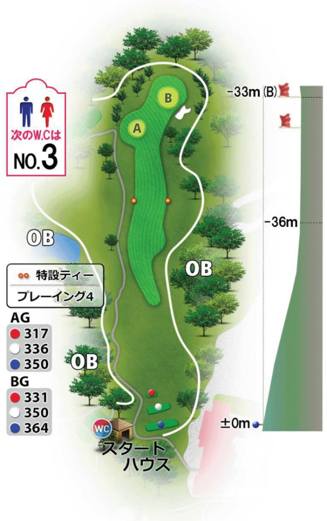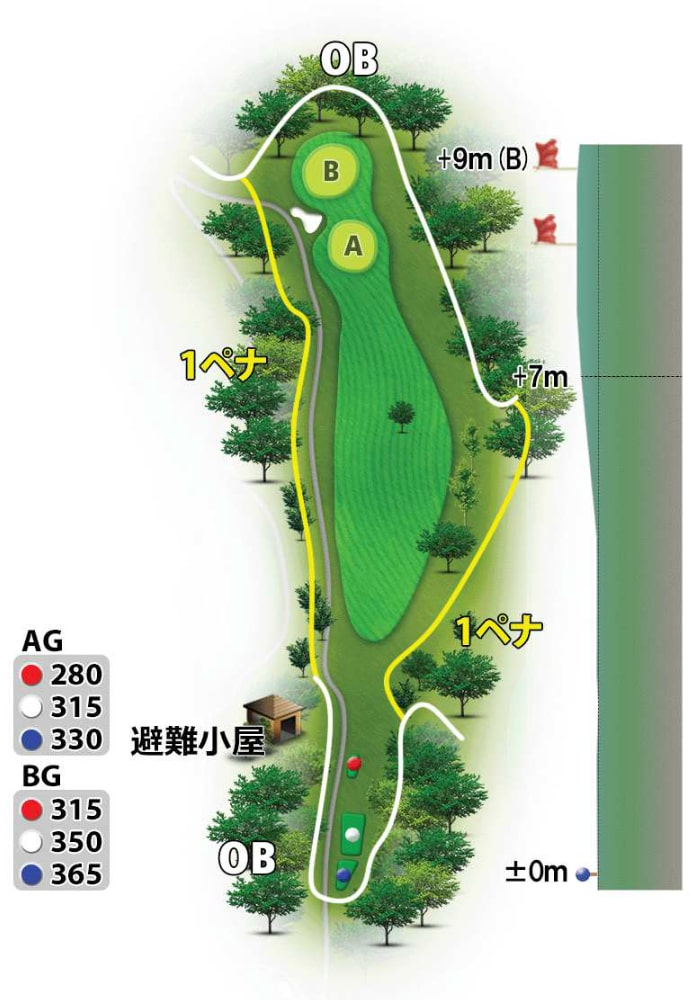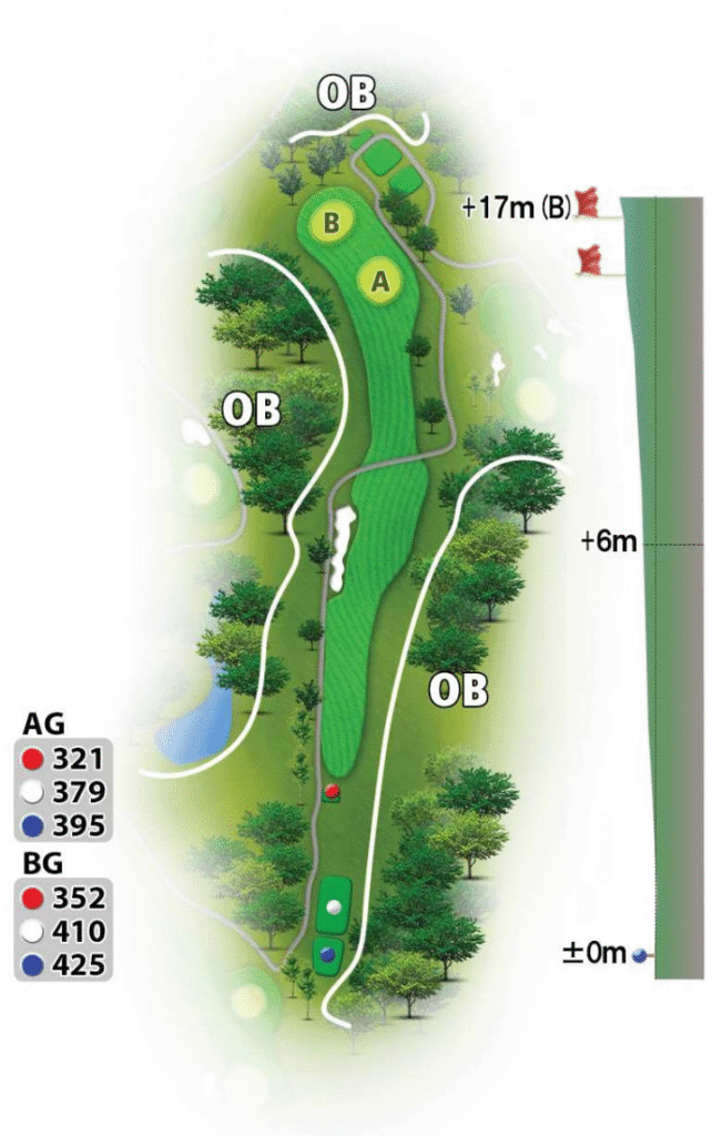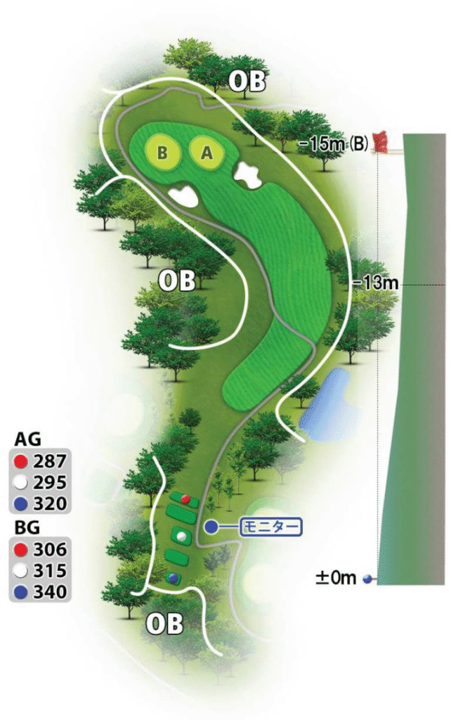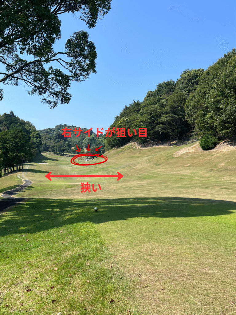 ティーショットはアイアン一択。150ヤードくらい打つイメージで十分。下り傾斜で転がってくれるのでセカンドもそんなに距離が残らないよ!