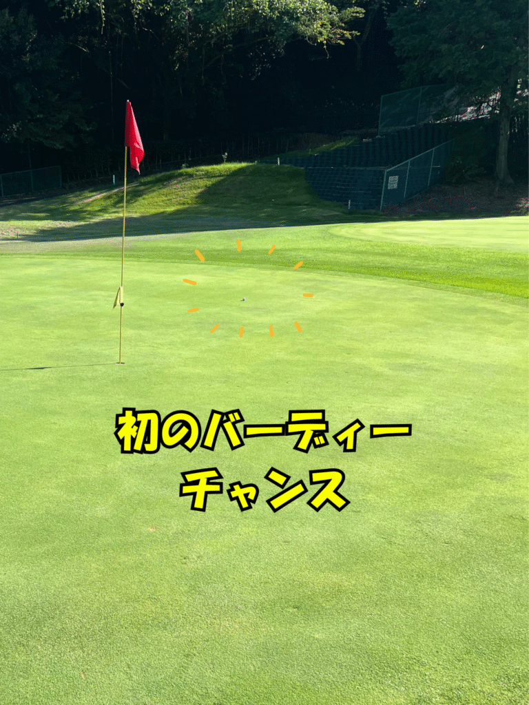 ここまでいい流れだったのに・・と落胆するも1回で脱出してグリーンオン。そこから2打で決めてボギーでしのげました。結構傾斜しているグリーンで、たまたまピンの位置が奥だったので助かりました。運も味方してる感じ!
