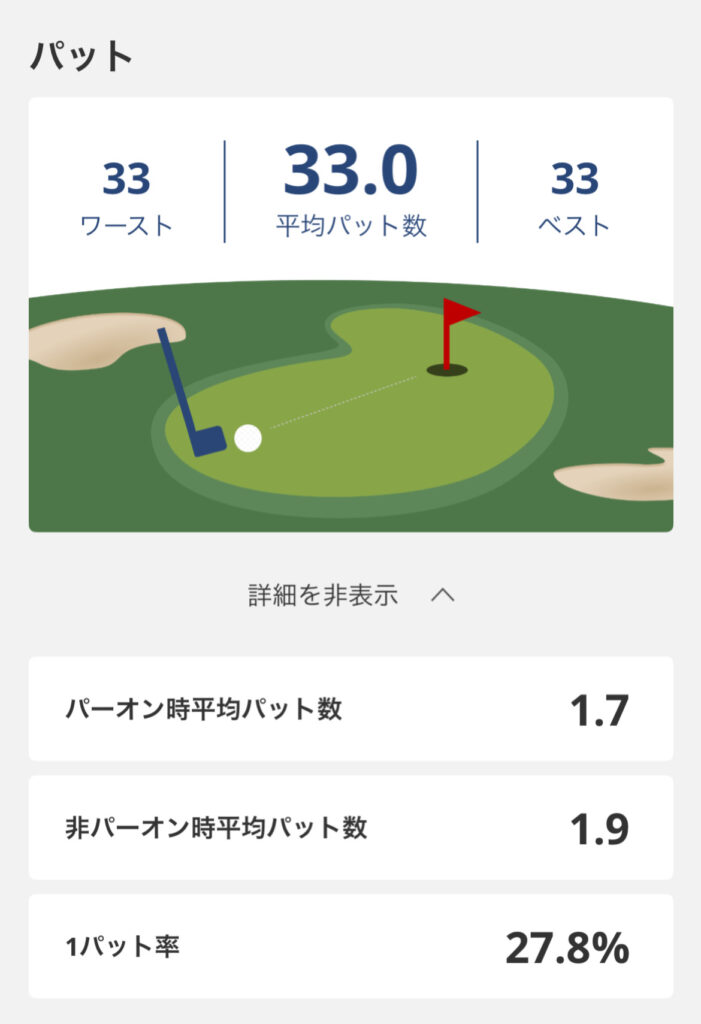 一緒にラウンドした人が強気のパットをする人で、自分はタッチを合わせるタイプなのですごく参考になりました。自分の中では36パット以内なら合格点!1パット率が27.8%とそこそこあるので、アプローチが上手くなってきたかもw