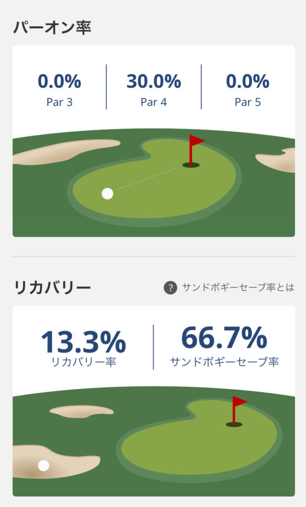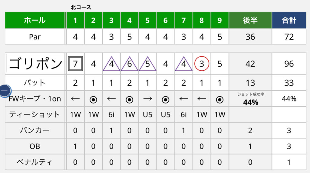パーオン率は絶望的ですね。パー5はもっと上げたいですね!アイアンの練習がんばります。