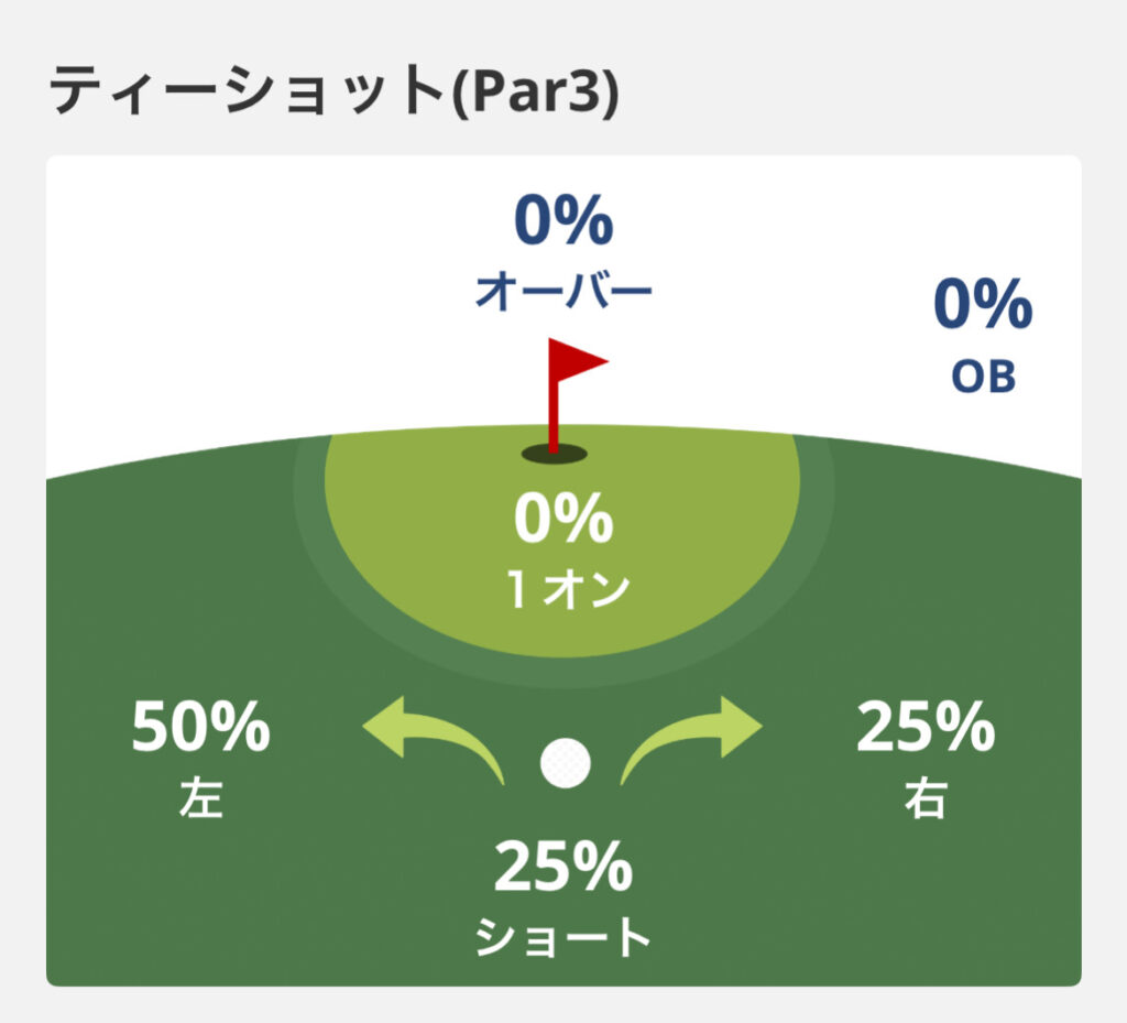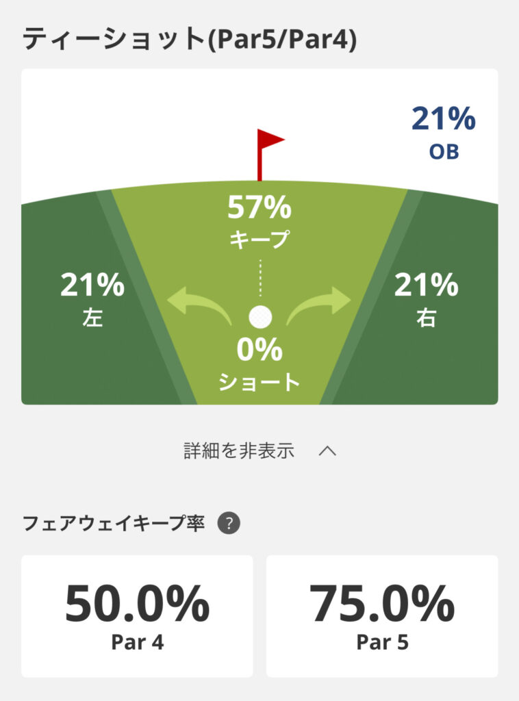 50%超えてればボチボチですね。ティーショットショットはそんなに悪くなかった印象ですが、やはり傾斜やハザードが効いてるのかも