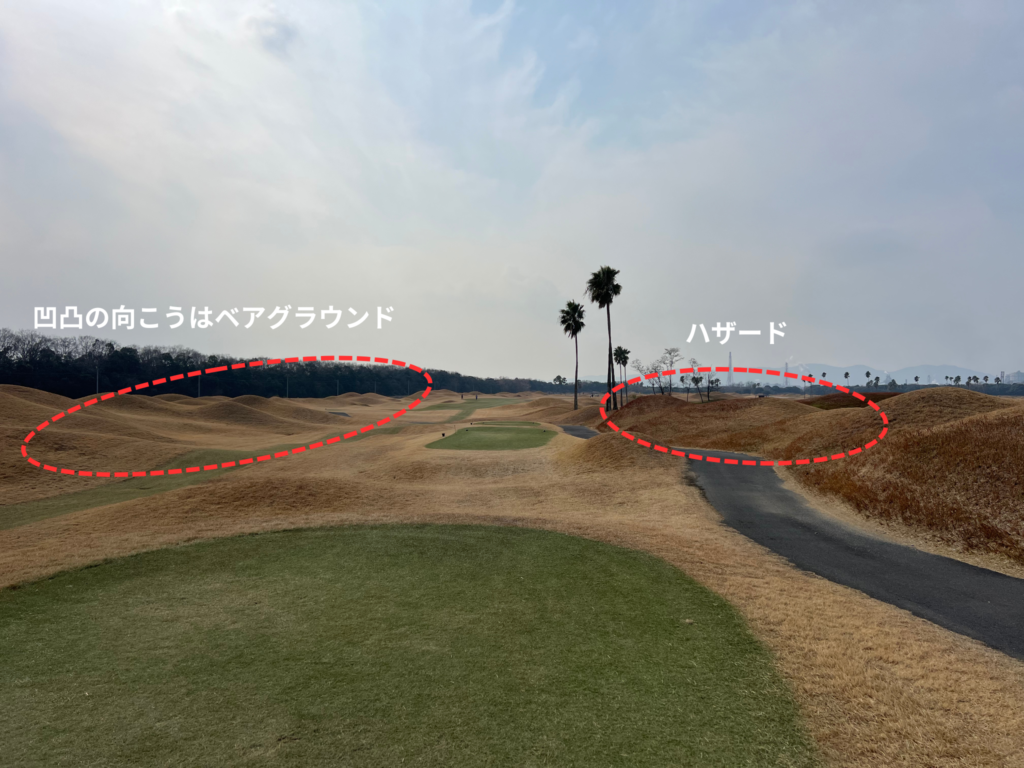 友人Kのティーショットはフェアウェイセンターにナイスショット!ここは大事にいきたい場面だが、ティーショットは右方向の凸凹したエリアに・・・