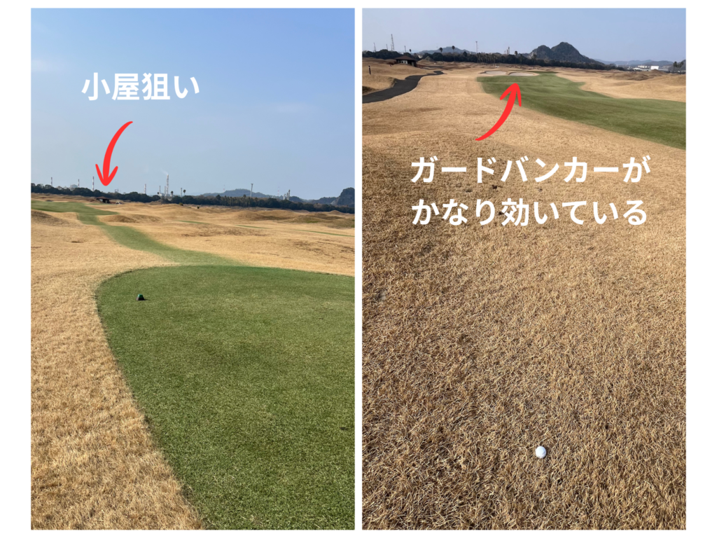 右手前のガードバンカーは入りやすそうなので要注意!事前にバンカー練習はしっかりしておこう