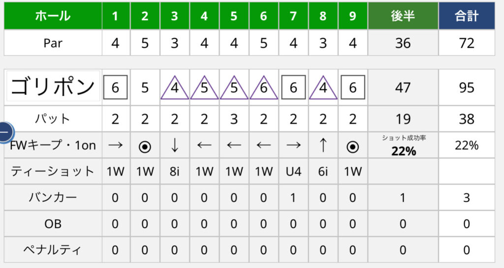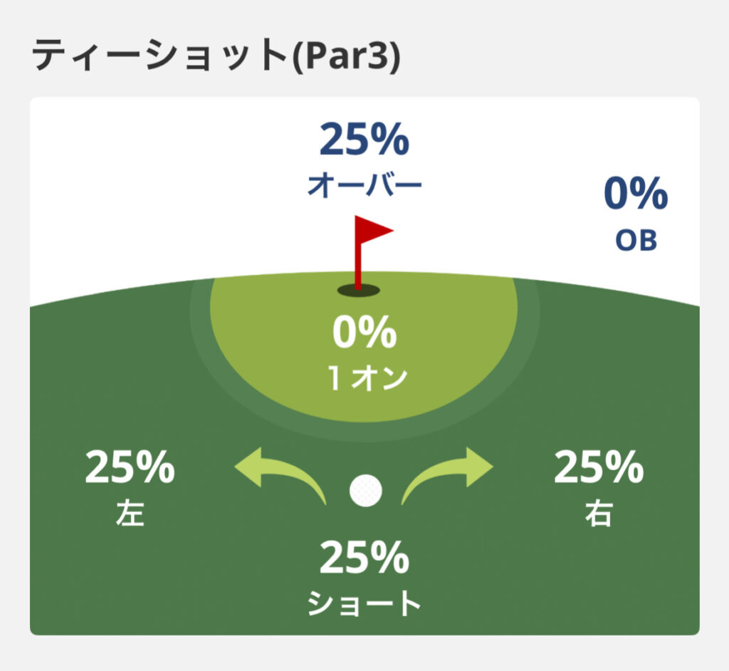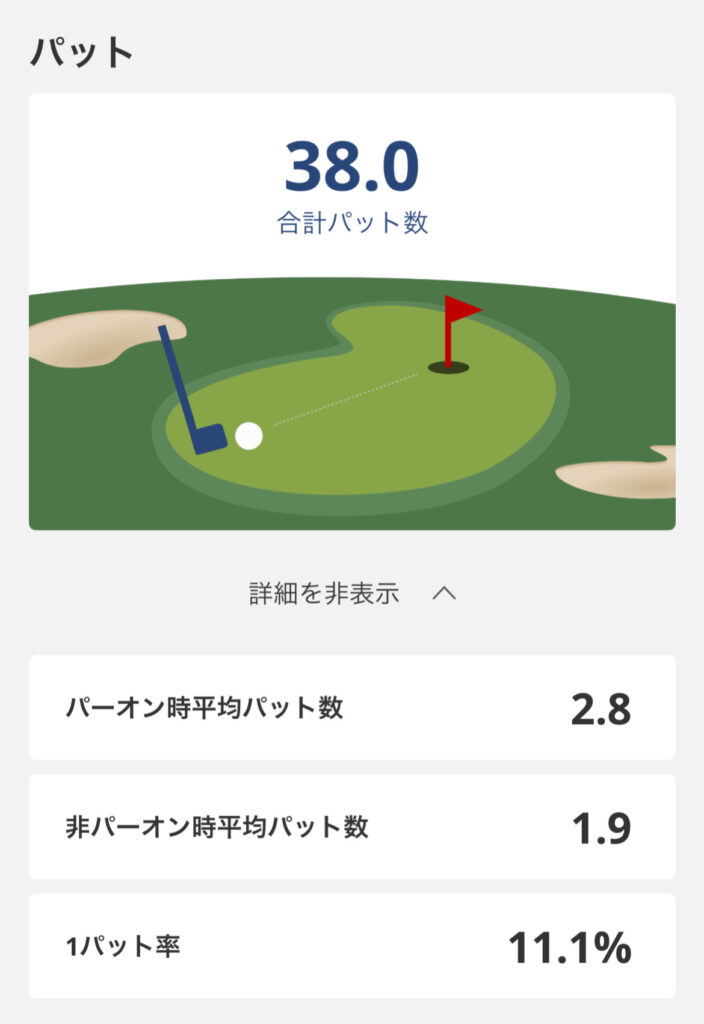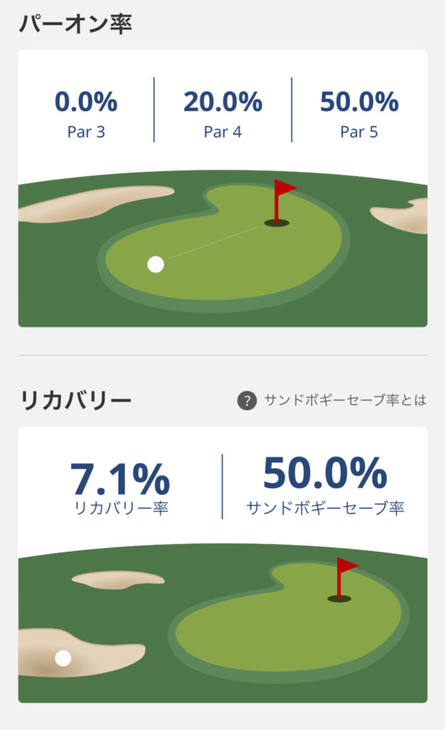 PAR5のパーオン率50%は嬉しいですね!スコアが安定しそうな傾向かも。PAR4のパーオン率をもっとあげていきたいので、アイアンはもっと練習する必要がありそうです。