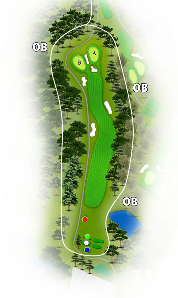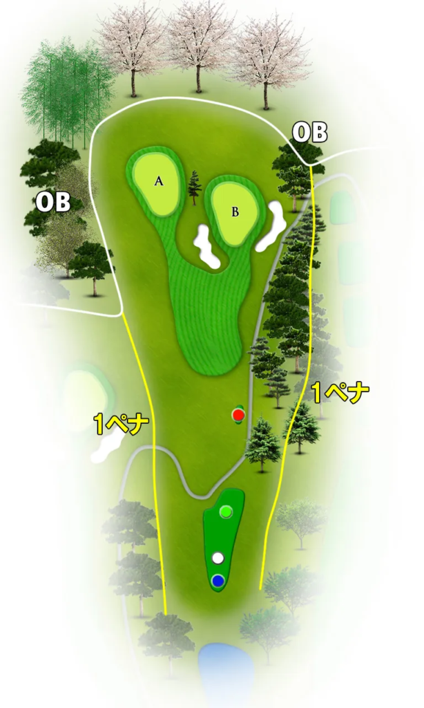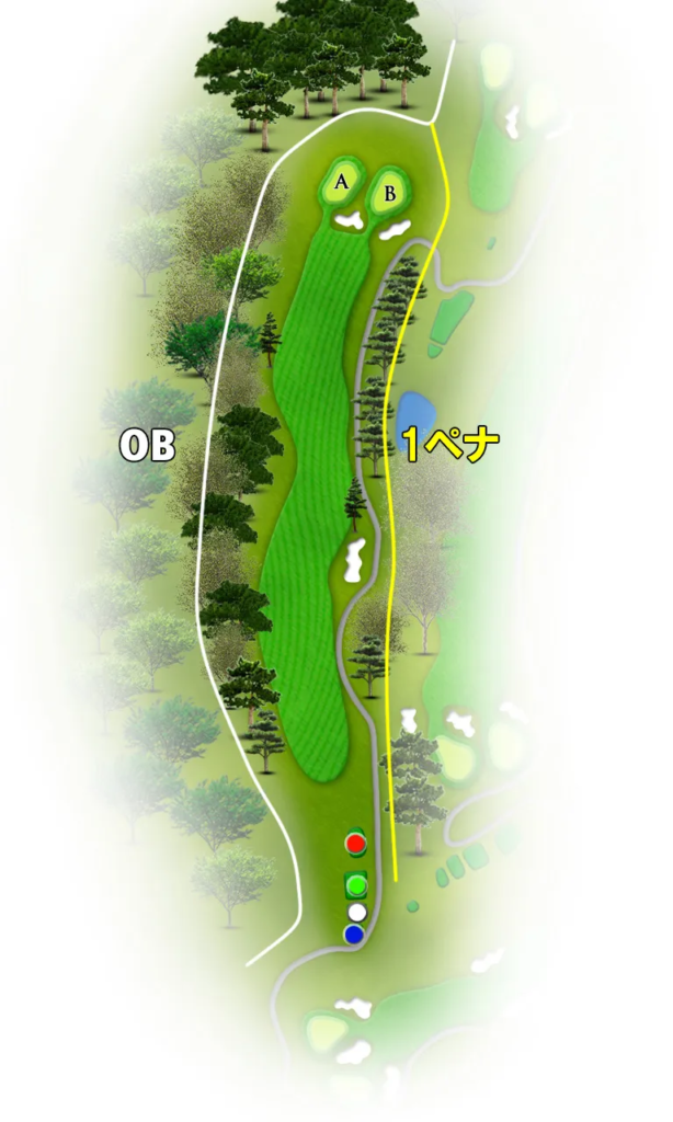 距離の長いミドルホール。FWキープ率56%と高いが、左サイドは距離を稼げる一方、OBリスクあるので要注意!ティーショットは右サイド安全策が推奨。2打目も長くなるため、大きめのクラブ選択が必須。パーオン率10%なので、無理せずボギー狙いでも全然OK