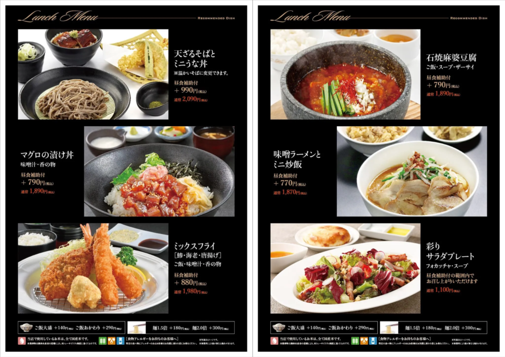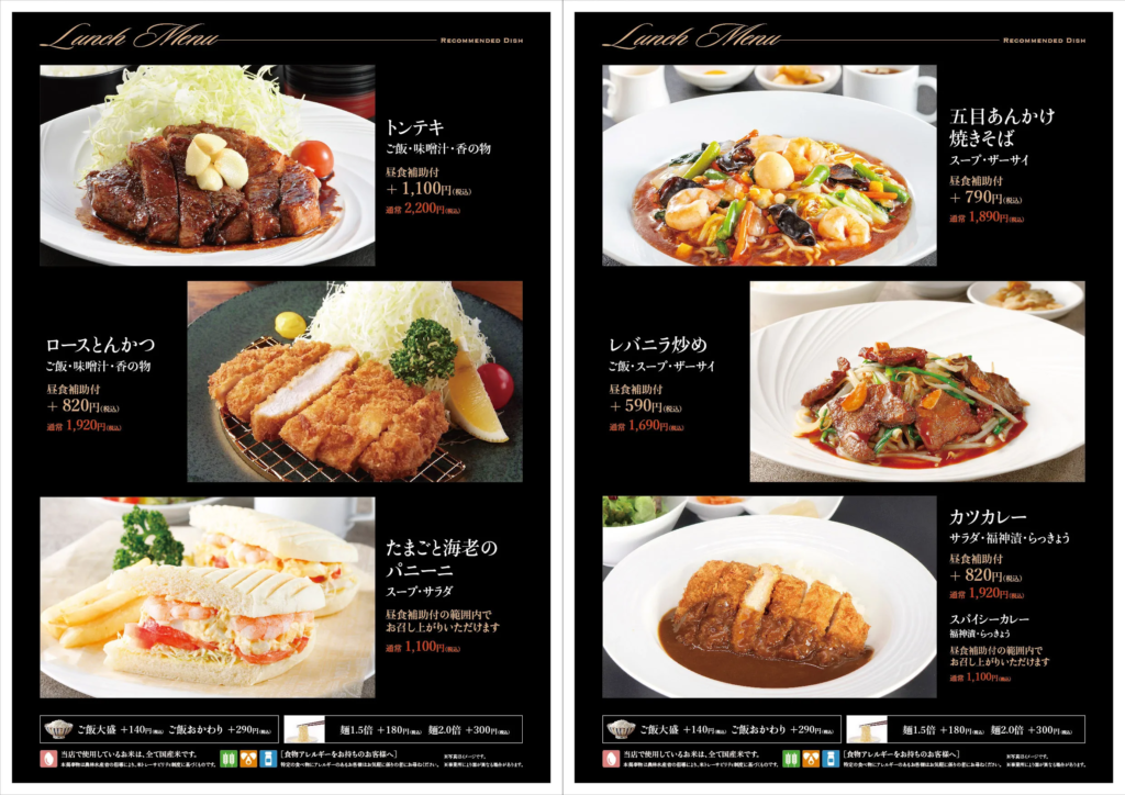 少し値は張るけど、ビジュアル的には『トンテキ』(食事補助付きで+¥1,100)が第1候補。『五目あんかけ焼きそば』(食事補助付きで+¥790)も捨てがたい。モリモリ食べて後半に備えよう!