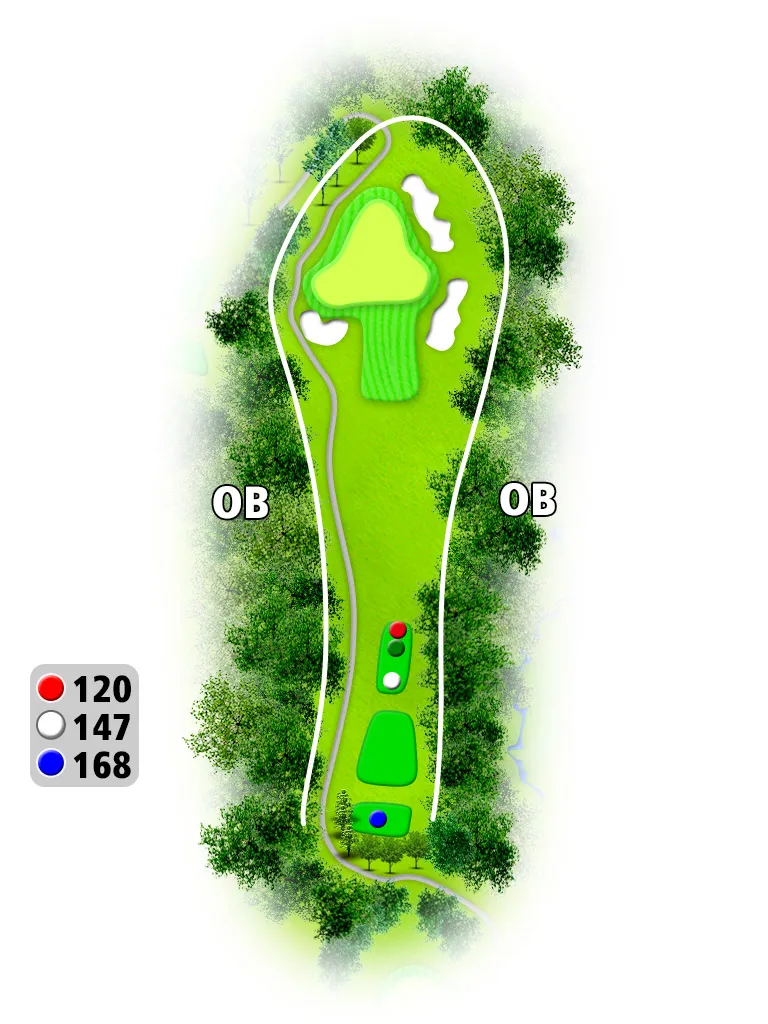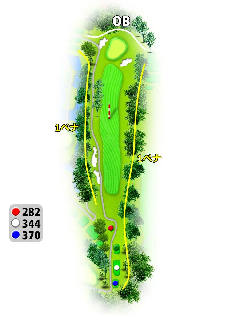 ここまでいい流れできているので置きに行くイメージで7Iを選択。軽めに打ったティーショットはボチボチ良い当たり。少し右方向に出たがOBまでは無いと高を括っていたが、グリーン周りに行ってみるとかなり浅い。このホールグリーン周りは全体的に浅いことが判明。完全に油断してた(汗)頑張ってボールを探すも見つかる筈もなくOB。