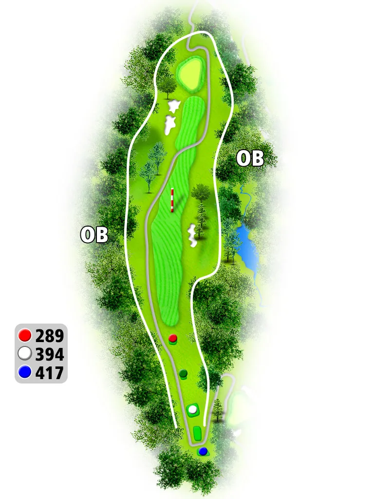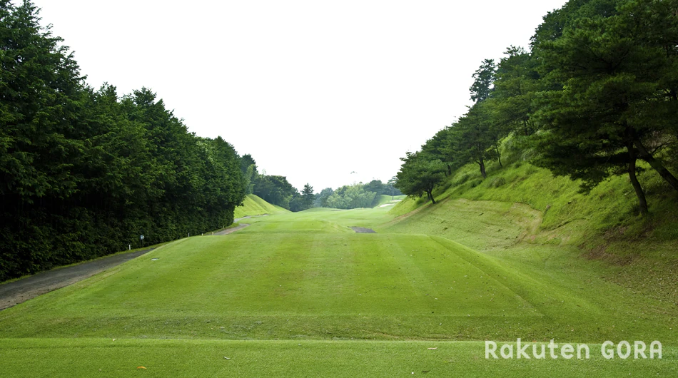 右ドッグレックのミドルホール。ドライバーが真っ直ぐとぶと左のOBラインを突き抜ける可能性があり、かといって飛ばし過ぎるとフェアウェイにある大きな木が気になるのでクラブ選択が難しいホール。U4かU5で迷ったが、U4で軽く打つことに決定。体がゆるんだせいかチョロしてフェアウェイまで届かず(涙)