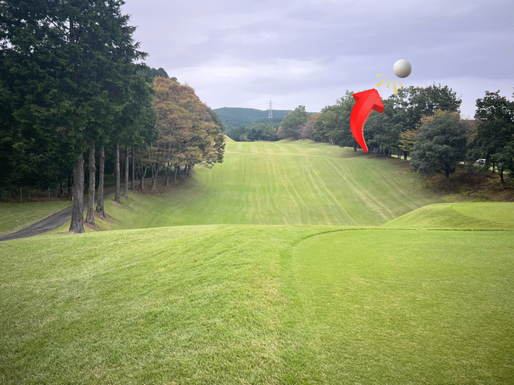 距離が長めでセカンド地点から少し上っているミドルホール。ティーショットは少しつかまって左方向へ。なぜかみんな同じ方向へ飛んでたので、もしかすると左に行きやすホールなのかも・・・