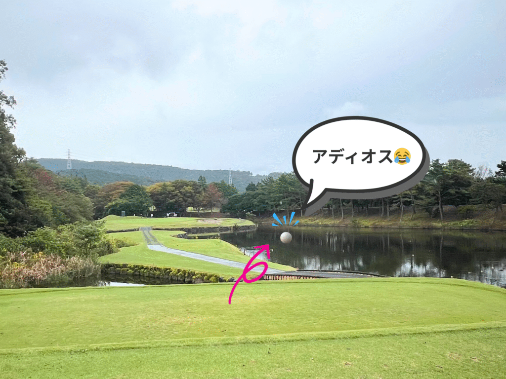 池に落ちたら特設エリアから打つらしく、なんと池に落ちてもプレーイング3であることが判明。メンタルが急激に回復w 特設エリアは下りのアプローチになるが、グリーンからすごく近く、アプローチしたボールはあわやパーになるかと思わせるくらいカップをかすめた。結局、楽々ボギーをゲットして最小失点で抑えられましたw