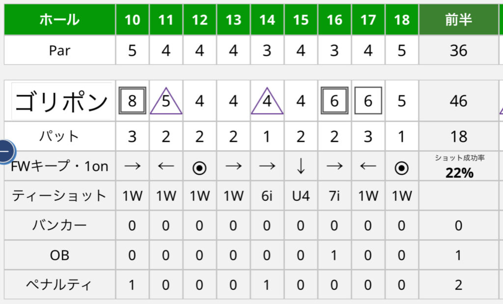 「友人達をどうやって引きずり下ろすか」しか考えていなかったが、結果的にはまぁまぁのスコア46で前半を終了することができました。友人Aのスコアが43だったので追いつかなかったけどねw(友人Bが54だったので少し安心w)