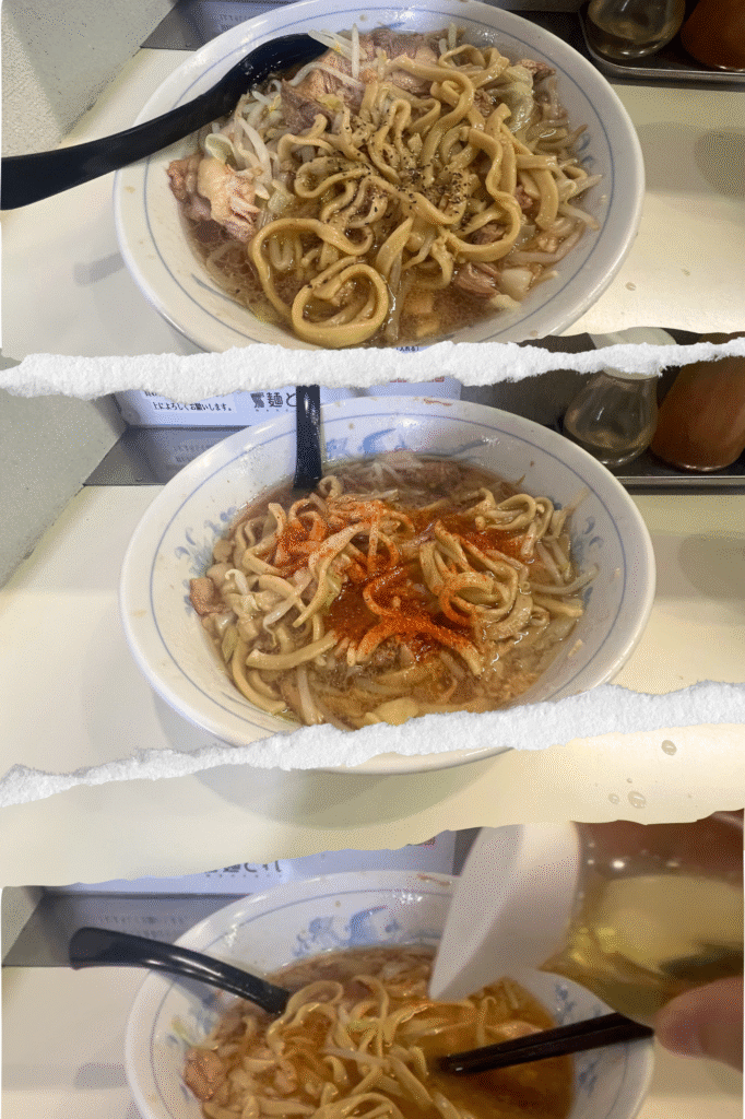 食べ進みながら、王道のトッピングで味変。黒胡椒➢唐辛子➢お酢のジェットストリームアタック(知らんか!?)でフィニッシュ♪美味しくいただきました。