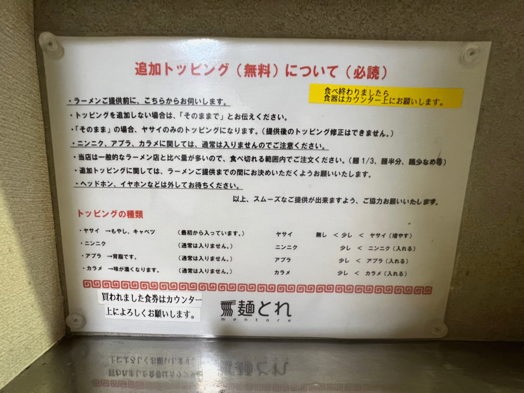 注文時ではなくラーメン提供直前にトッピングを聞かれるので、ヘッドホンなどは外して集中して待ちましょう♪