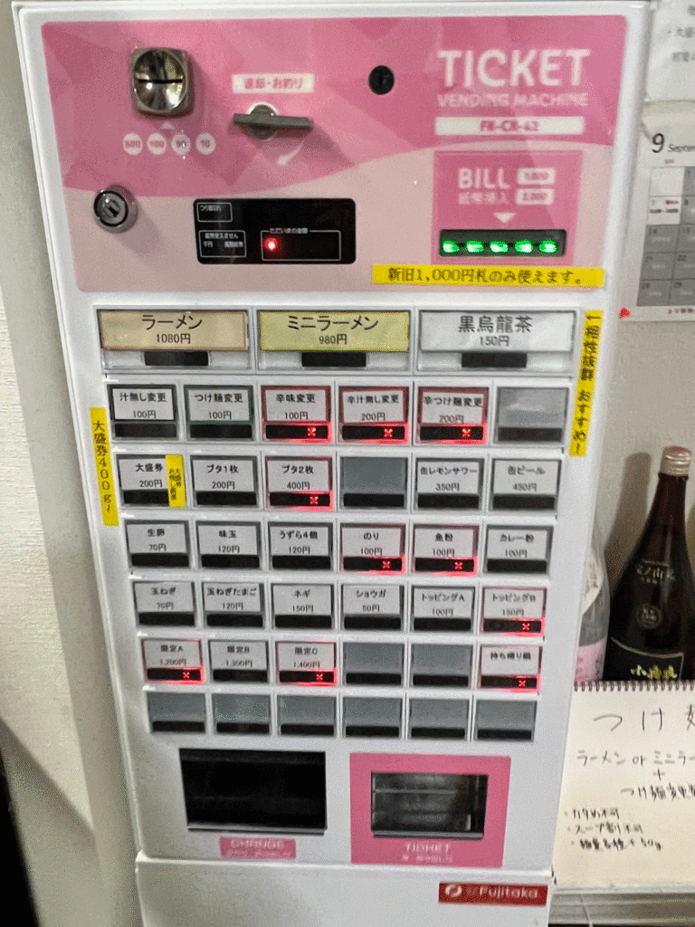 『初めて訪問する店の券売機は左上のボタンを押す』という極めて個人的なルールに従い、『ラーメン(¥1,080)』を購入。普段ならブタ2枚のトッピングを購入するところだが、売り切れだったので『ブタ1枚(¥200)』を購入しカウンターへ向かう。